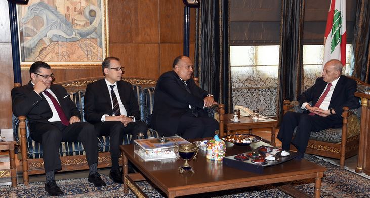 Parliament Speaker Nabih Berri welcomed on Wednesday before noon at Ain El-Tineh Egypt’s Foreign Minister Sameh Shukri, the accompanying delegation and the Egyptian Ambassador to Lebanon Nazih El-Najari with talks featuring high on bilateral relations and regional developments.