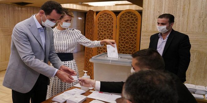Syrian President Bashar al-Assad and Mrs. Asma al-Assad on Sunday cast their votes in the People’s Assembly elections for the 3rd legislative term in the polling station at the Ministry of Presidential Affairs.
