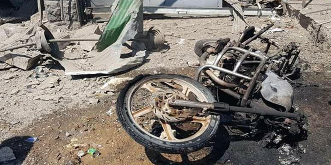 SANA reporter in Hasaka quoted local sources as saying that an explosive device attached to a motorcycle went off in the surroundings of the post office in the center of Ras al-Ayn city, causing the martyrdom of two civilians and the injury of others.