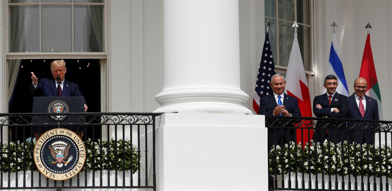 In front of a crowd of several hundred people on the White House lawn, U.S. President Donald Trump hosted the White House ceremony during which Emirati Foreign Minister Sheikh Abdullah bin Zayed al-Nahyan and Bahrain’s Foreign Minister Abdullatif Al Zayani with Zionist PM Benjamin Netanyahu signed accords.