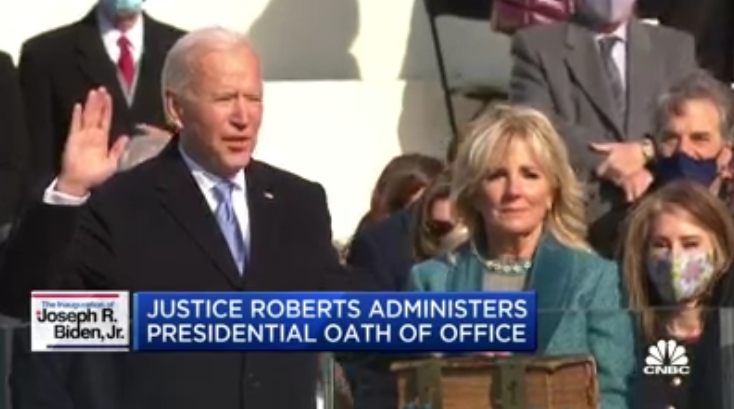 Biden took the oath of office from Supreme Court Chief Justice John Roberts, with his left hand on a family Bible. Speaking after he became president, he declared, “Democracy has prevailed.”