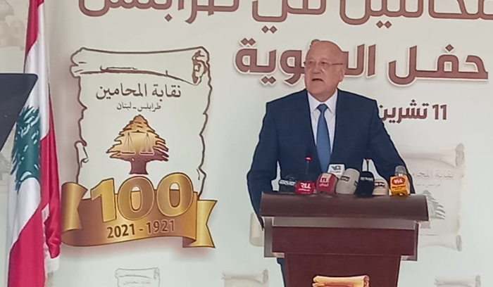 Prime Minister Najib Mikati said, in a speech he gave during his patronage of the centenary of the Tripoli Bar Association celebration, “It is true that I deal positively and openly with challenges, whatever their size, and give discussion and dialogue its maximum extent, but it is also true that dialogue stands at the limits of national and personal convictions which I never deviate from, the most prominent of which is the independence of the judiciary as well as the protection of the constitution and institutions, the preservation of Lebanon’s Arab affiliation, and the maintenance of brotherly relations with Arab brothers.”