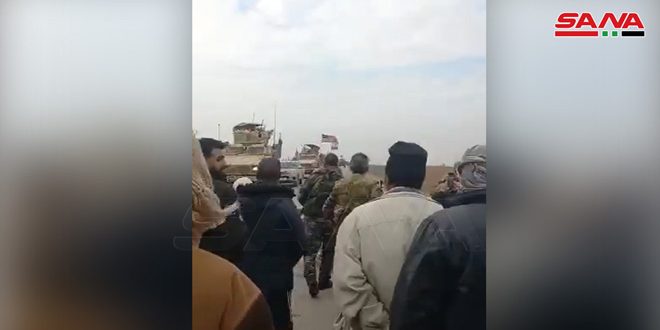 Civil sources in Qamishli countryside told SANA reporter that the people of Damkhiya village in Hasaka northern countryside intercepted a convoy of the US occupation forces, consisting of five armored vehicles, accompanied by a military vehicle belonging to QSD militia, which attempted to cross Damkhiya checkpoint and forced it to retreat and leave the area.