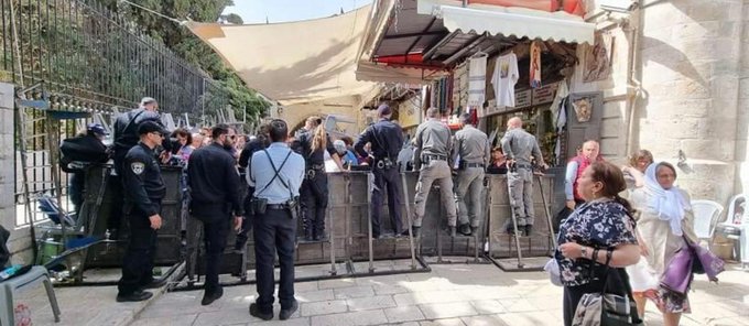 Israeli occupation police closed all gates leading to the old city, forcing the Christians who want to reach the church to go through only one gate, the New Gate, while being monitored and restricted by the police manning this gate.