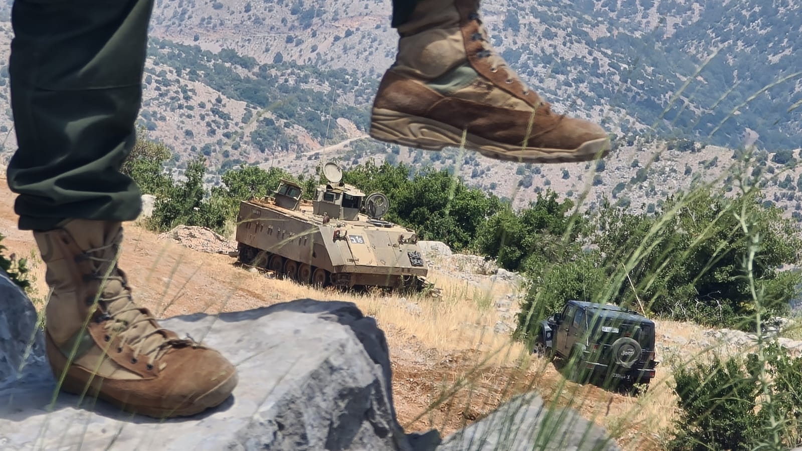 Al-Manar reporter Ali Shoeib circulated via his Twitter account a photo that shows the boot of one of Hezbollah fighters above an Israeli military tank.