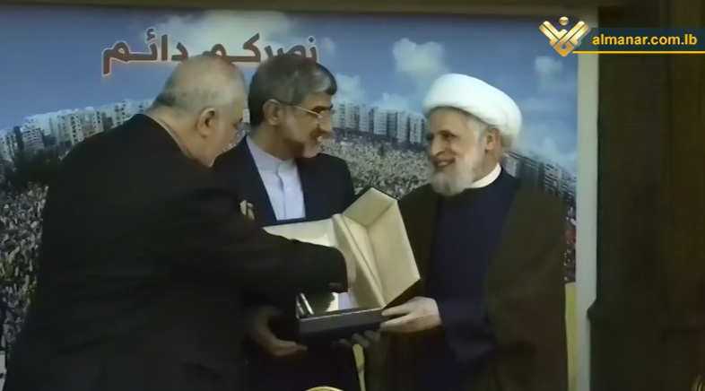 During the ceremony, which was attended by a number of Amal Movement lawmakers, Sheikh Qassem handed the Iranian diplomat a Shield of Appreciation.