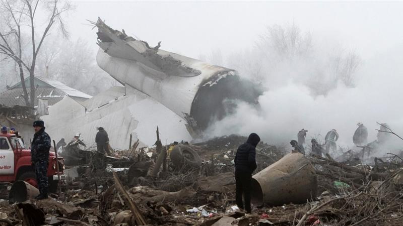 A Turkish cargo jet has crashed near Kyrgyzstan’s Manas airport, killing at least 32 people, most of them residents of a village struck by the Boeing 747 as it tried to land in dense fog, Kyrgyz officials said.