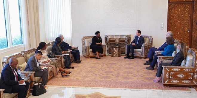 President al-Assad, meeting Deputy Minister of International Relations and Cooperation of the Republic of South Africa, Candith Mashego-Dlamini, and an accompanying delegation, affirmed that terrorism can’t be combated only through armies, saying that the extremist mentality is moving in speedy way among states, and it doesn’t recognize any limits, but it flows directly through Web among the people, and from this point comes the necessity of moving on the level of bilateral relations among countries in the domains of economy and culture.
