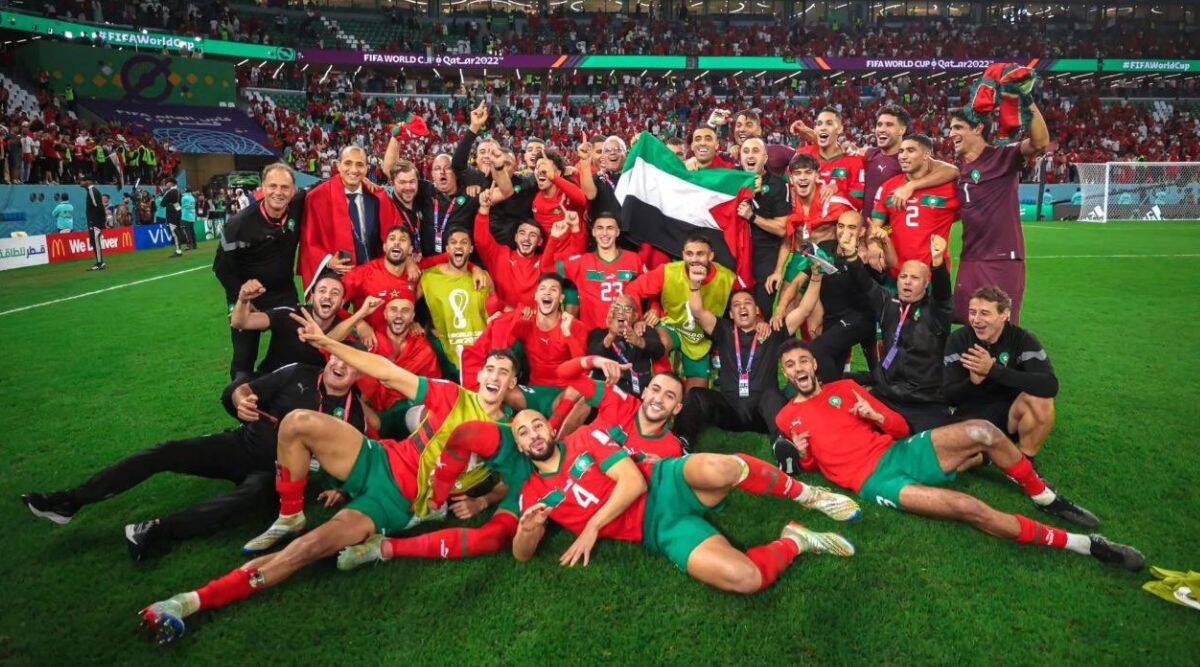 After their stunning victory over Spain on Tuesday, the Moroccan football team gathered on the field and celebrated it with a Palestinian flag alongside several Moroccan ones.
