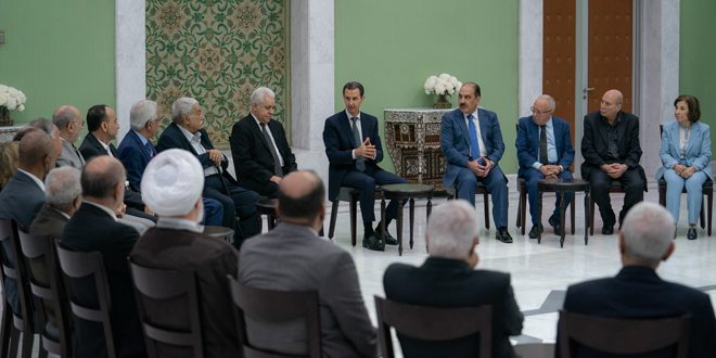 Syrian President Bashar al-Assad received on Wednesday members of the Arab National Conference as talks dealt with the Pan-Arabism, national thought and identity, and the role of the Arab parties in light of the growing challenges and western thought.