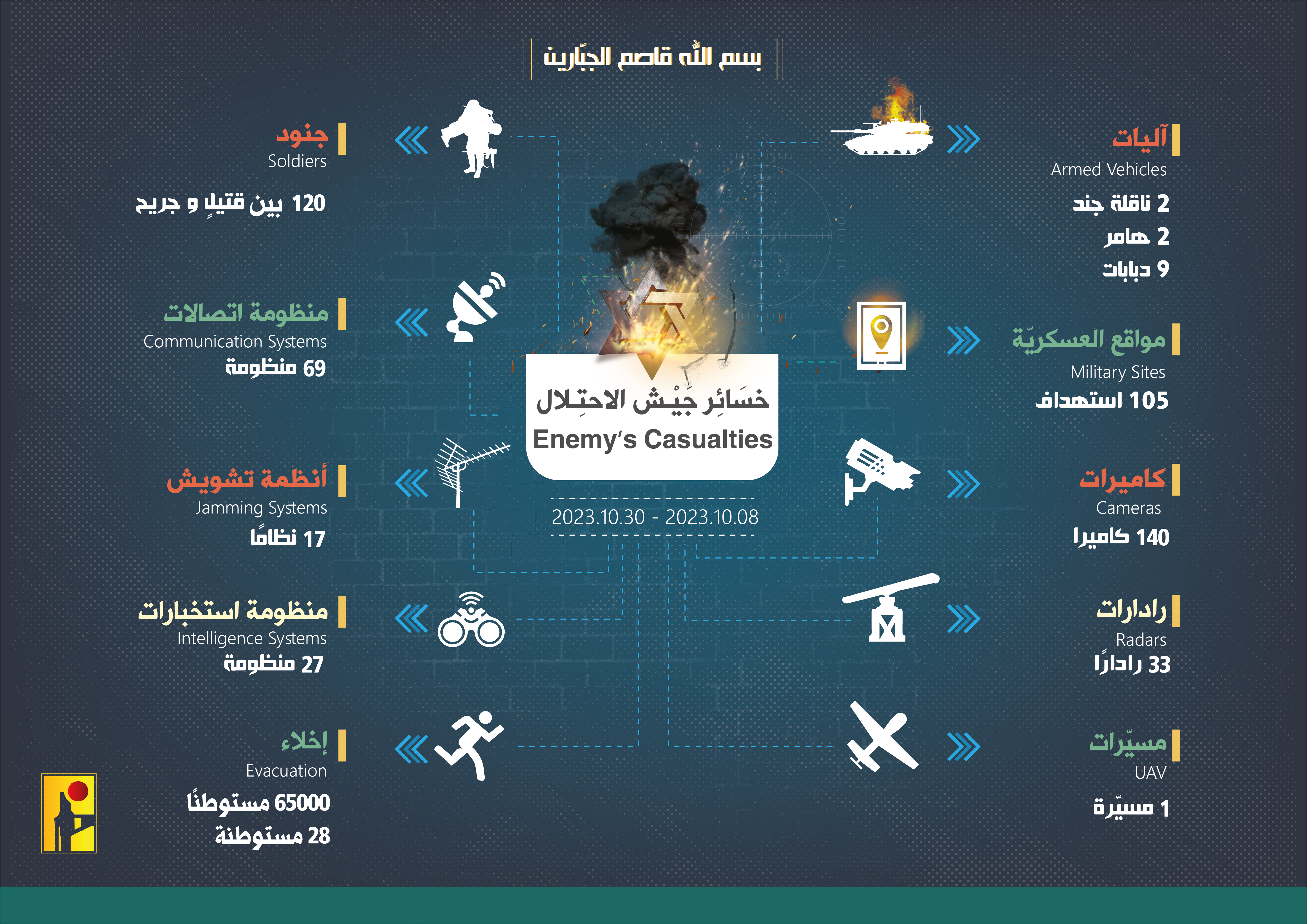 The Islamic Resistance’s military media published an infographic demonstrating the Israeli occupation army’s casualties on the Lebanese border with occupied Palestine after 23 days of resistance operations “on the road to Al-Quds.”