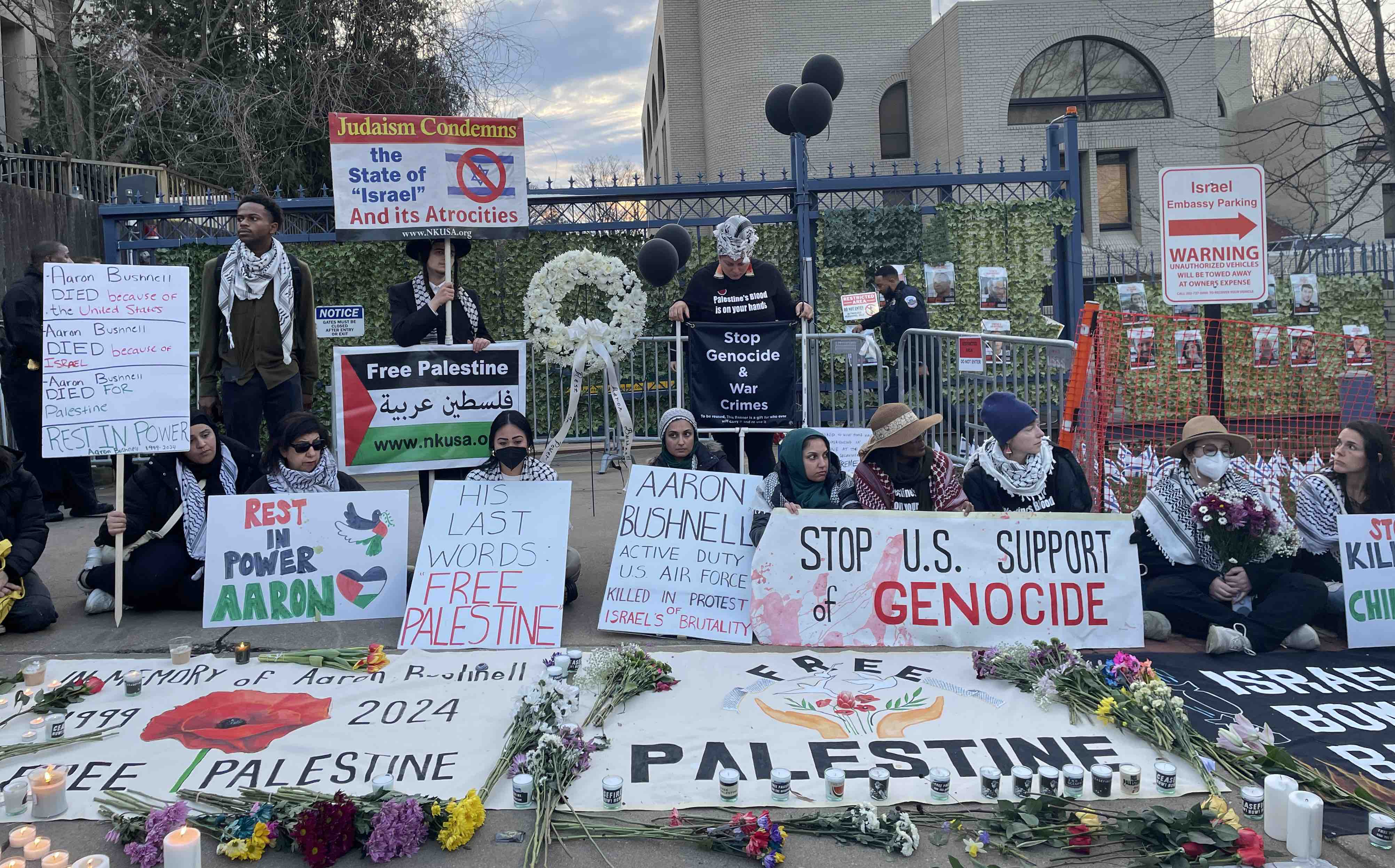 Hundreds gathered in a vigil outside the Israeli embassy in Washington, following a tragic incident where a member of the US Air Force, Aaron Bushnell, set himself on fire in protest against Israel’s actions in Gaza.