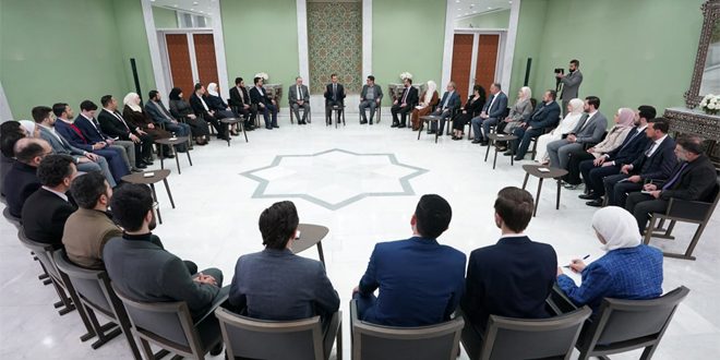 Syrian President Bashar al-Assad received on Monday the volunteer team of the Dialogue Center for Virtual Education that comprises a group of young academics in various specializations who are engaged in dialogue about the religious, intellectual, and social issues.