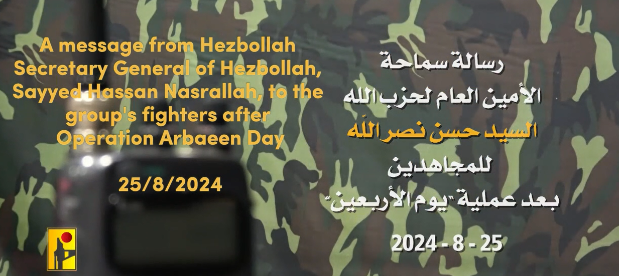 Hezbollah’s military media released a message from Secretary General Sayyed Hassan Nasrallah to the Islamic Resistance’s fighters following their execution of Operation Arbaeen Day.