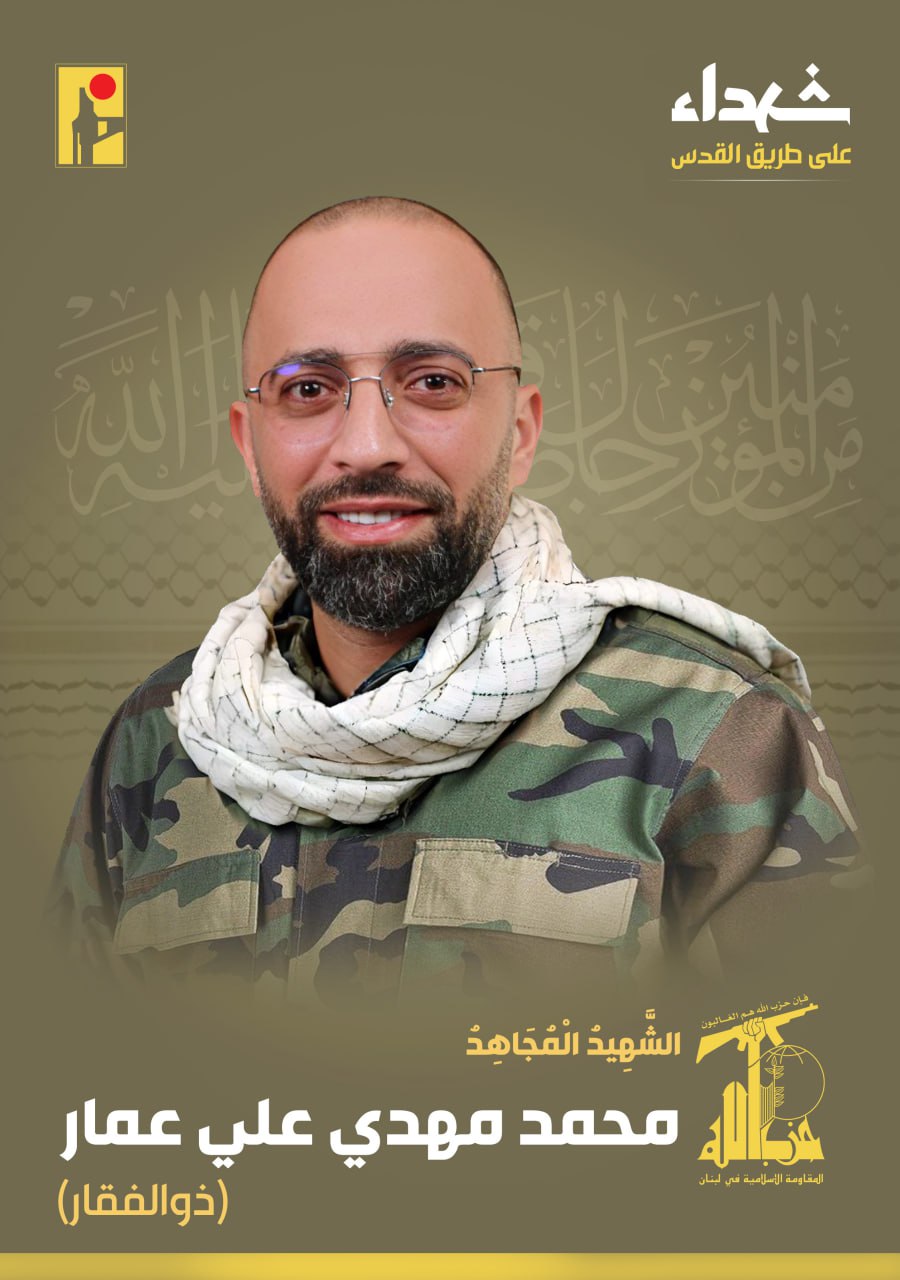 Hezbollah’s Islamic Resistance mourns Martyr All the Way to Al-Quds Mohammad Mahdi Ali Ammar (Zulfikar), born in 1985, from the town of Burj Al-Barajneh in the southern suburbs of Beirut (Dahiyeh)
