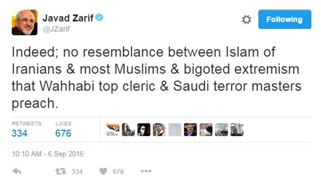 On his Twitter account, Zarif posted: “Indeed; no resemblance between Islam of Iranians & most Muslims & bigoted extremism that Wahhabi top cleric & Saudi terror masters preach.”