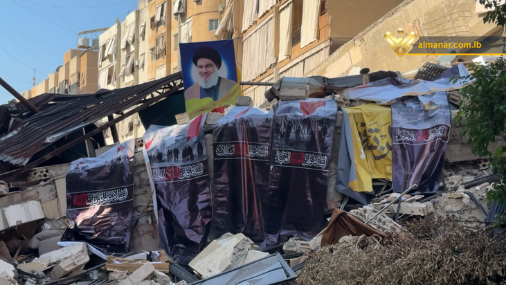 Hezbollah flags and the photos of Hezbollah Secretary General Martyr Sayyed Hasan Nasrallah topped the debris across Dahiyeh which confirmed allegiance to the path of resistance and victory.