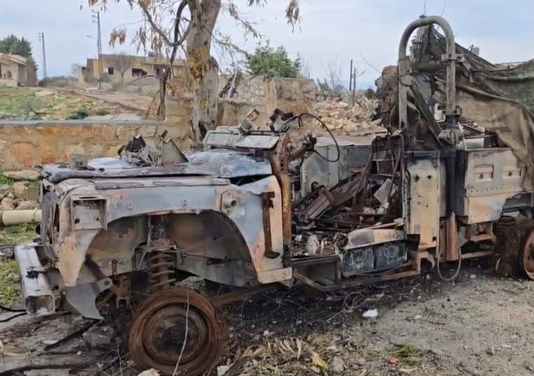 An Israeli vehicle, Humvee, as well as munitions used by the enemy to bombard the Lebanese towns appeared destroyed and burnt by Hezbollah fighters, who steadfastly fought the enemy for 66 days and prevented it from advancing into the second the line of the Lebanese villages..