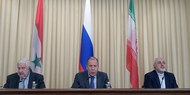 In a joint press conference following the tripartite meeting held in Moscow, Deputy Prime Minister, Foreign and Expatriates Minister Walid al-Moallem thanked his Russian counterpart, Sergei Lavrov for his invitation to visit Moscow after the US aggression against Syria, extending gratitude to the Iranian Foreign Minister Mohammad Javad Zarif for attending the meeting which conveys a firm message after the attack.