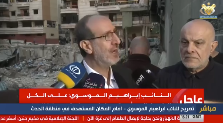 MP Ibrahim Al-Moussawi, a member of Hezbollah’s Loyalty to Resistance bloc, called on Lebanese Prime Minister Nawaf Salam and his ministers to visit the southern suburbs of Beirut (Dahiyeh) to witness firsthand the Israeli aggression against Lebanon and its people.