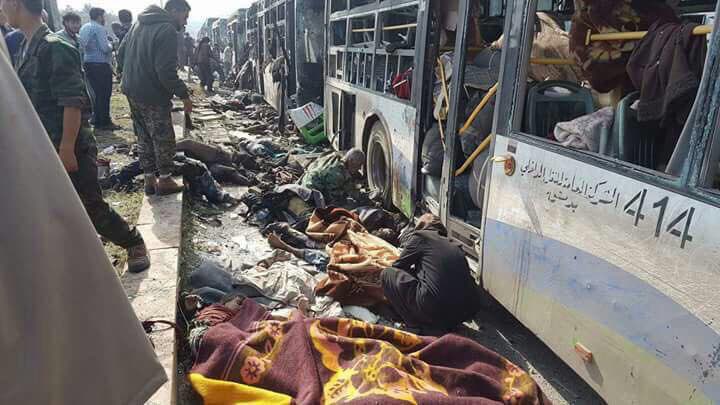 On Saturday, a horrific terrorist car bomb attack targeted a bus convoy with evacuees from the besieged Syrian towns of Foua and Kefraya in Al-Rashidin area on Aleppo’s outskirts.