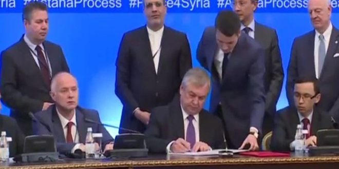 The signing took place during the plenary session of the Astana 4 meeting held in Kazakh’s capital of Astana with the participation of the delegation of the Syrian Arab Republic headed by Bashar al-Jaafari and other delegations.