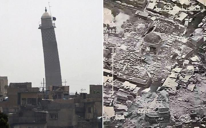 “Our forces were advancing toward their targets deep in the Old City and when they got to within 50 meters (yards) of the Nuri mosque, Daesh committed another historical crime by blowing up the Nuri mosque and the Hadba” minaret, said Lieutenant General Abdul Amir Yarallah in a statement released on Wednesday night, referring to the Arabic acronym of ISIL.