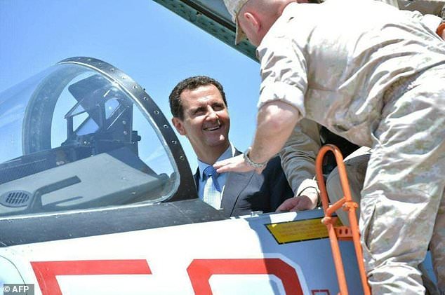 In one video posted on the account, a smiling Assad, dressed in a suit and tie, is seen climbing a ladder and taking a seat inside the cockpit of a Sukhoi fighter jet.