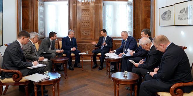 The Syrian President Bashar al-Assad received on Thursday Russian President’s Special Envoy Alexander Lavrentiev and an accompanying delegation.
