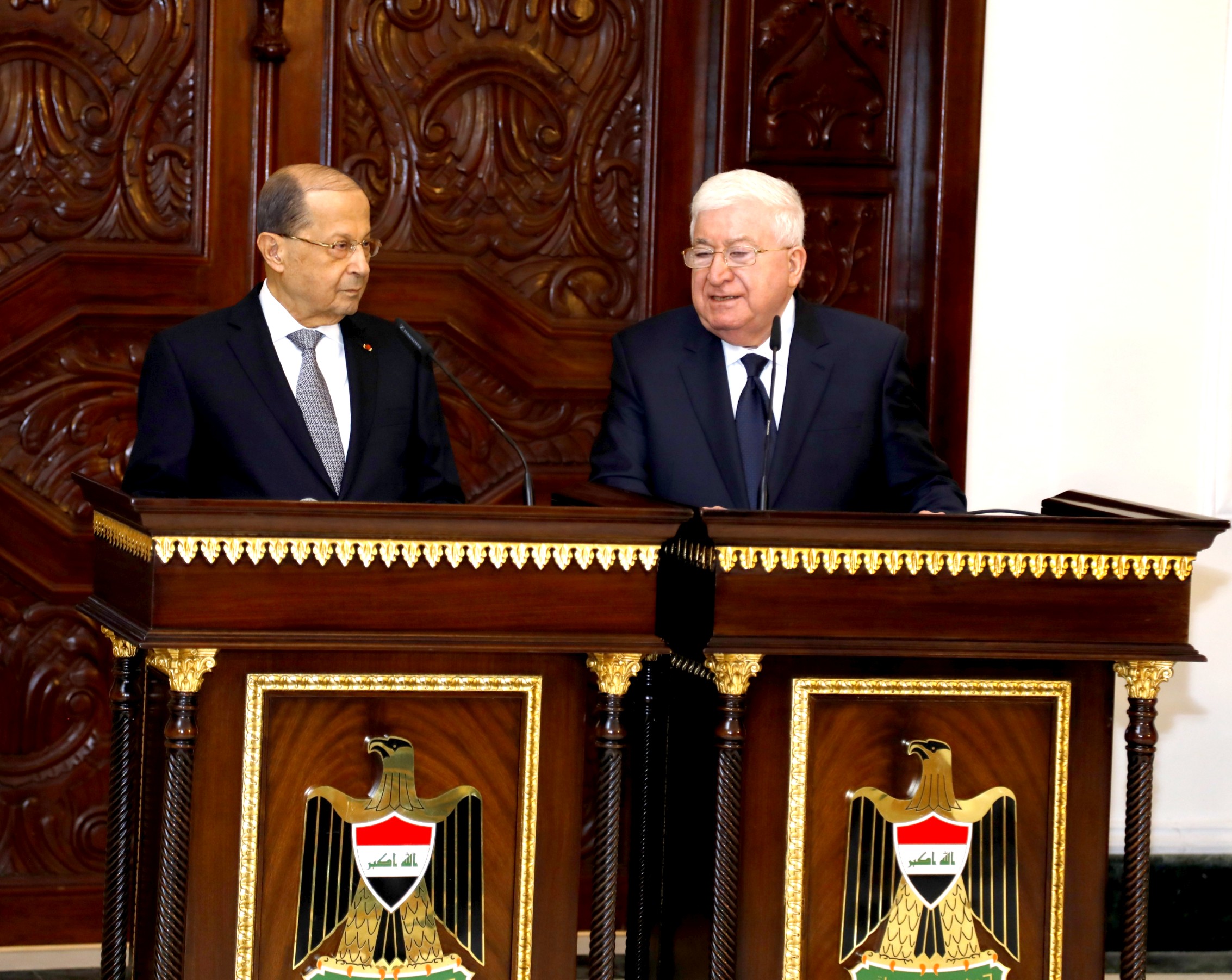 Lebanese President Michel Aoun and his Iraqi counterpart Fouad Masoum addressed a joint press conference in the wake of a round of talks held between the two sides at the Peace Palace in Baghdad.