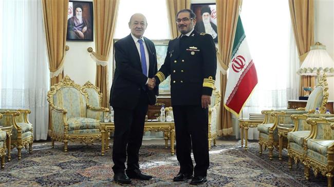 Iran’s secretary of the Supreme National Security Council, Ali Shamkhani, greeted on Monday France’s Foreign Minister Jean-Yves Le Drian in his official military uniform.