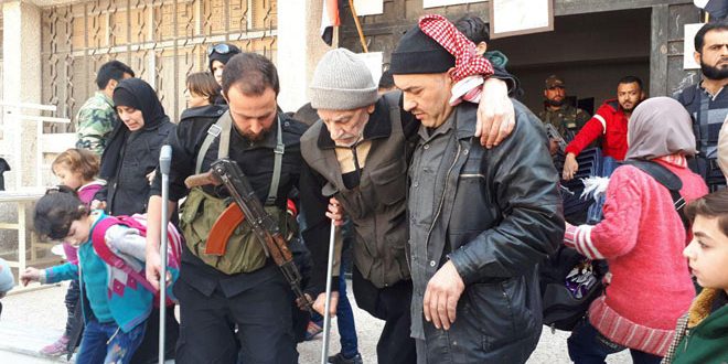 SANA’s correspondent to al-Wafideen Camp said that scores of civilians, mostly women, children, and elderly people, on Tuesday morning arrived in al-Wafideen camp through the safe corridor after securing their exit by the units of the Syrian Arab Army. These civilians exited Gouta in three batches.