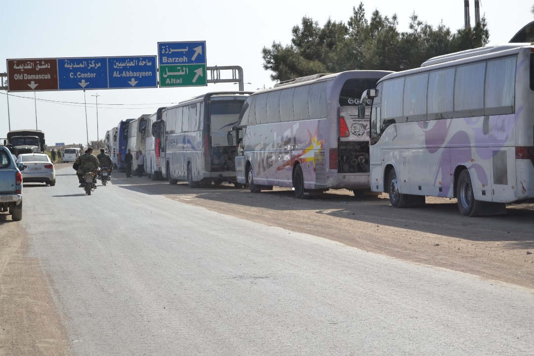 The correspondent indicated that a number of buses entered through Erbin corridor into Jobar to transport the militants and their families, adding that the buses stop at a gathering area on Harasta Highway accompanied by patrols from the authorities and a number of ambulances which carry on board some patients and a number of injured terrorists.