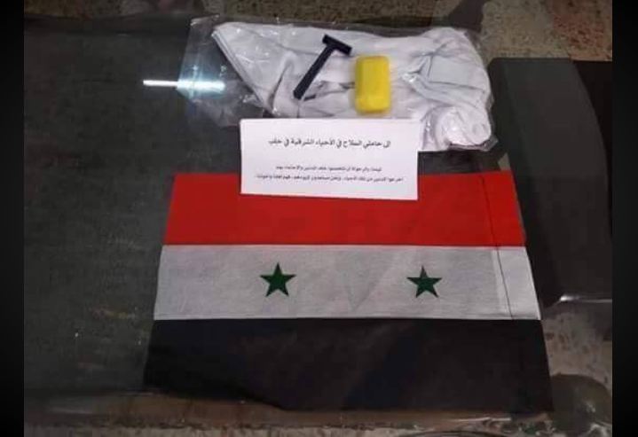 The Syrian helicopters on Friday threw over the eastern neighborhoods of Aleppo sacks which contain Syria flags soaps, razor blades and letters to urge the militants to exit the area.