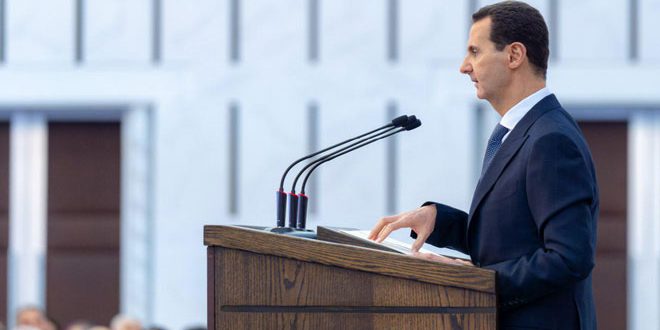 President al-Assad added “the scheme of imposing hegemony on the world led by the US hasn’t changed and our people’s resistance has become more solid, affirming that the homeland isn’t a commodity and it is sacred and it has its real owners and not thieves.”
