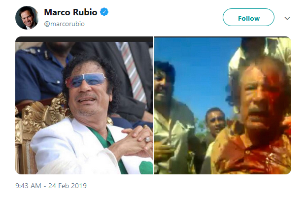 US Senator Marco Rubio has tweeted two photos of late Libyan leader Muammar Gaddafi – one showing him alive and well and still at the helm of the country, while the other featured his bloodied face as he was being brutally tortured before his murder.