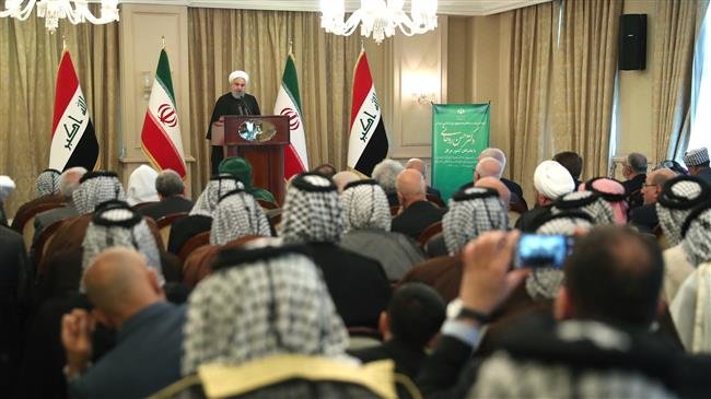 In a meeting with Iraqi religious and tribal leaders and elites in Baghdad, Rouhani said the hegemonic powers brought Daesh and other terrorists to the region in an attempt to sow discord among neighboring countries, nations, tribes and religions so they could justify their illegitimate presence in the region, portray a violent image of Islam and ultimately represent themselves as the “saviors.”