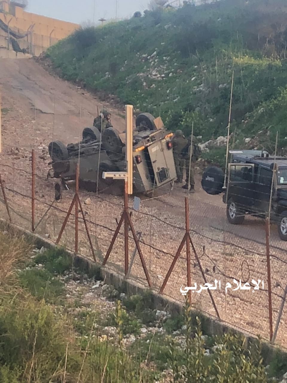 Hezbollah War Media Center released on Thursday photos of an Israeli military vehicle which was flipped at the border between Lebanon and the occupied territories.