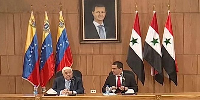In a press conference with Venezuelan Foreign Minister Jorge Arreaza on Thursday Deputy Foreign and Expatriates Minister Walid al-Moallem said “we discussed situations in Venezuela and Syria and US conspiracy against the states.”