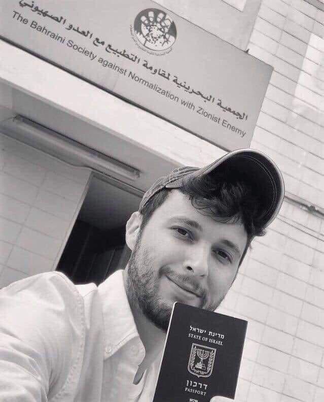 Another Israeli journalist also posted his photo. However, he wanted to send a “pro-normalization” message as he appeared in the photo holding the Israeli passport near the Bahraini Society against Normalization with the Zionist Enemy. The photo was circulated by Bahraini activists on social media, but the identity of the journalist was no mentioned.