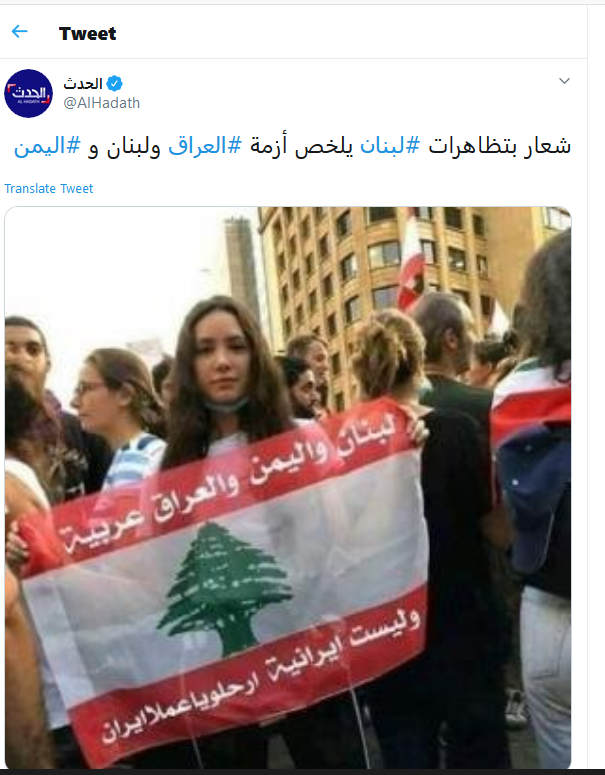 The news service posted on its Twitter account on Monday a visibly manipulated photo, showing a Lebanese protester holding the national flag with anti-Iran slogan written on it.