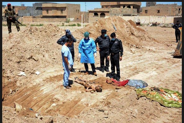 Men in Iraqi security forces uniforms used ropes to pull two bodies, one of them headless, from the grave, and also removed a decapitated head, but they were later told to return them to their original locations.