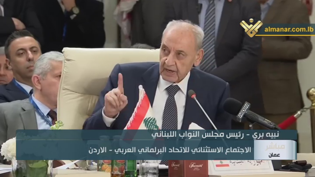 Delivering Lebanon’s speech during the urgent meeting of the Arab Parliamentary Union in the Jordanian capital of Amman, Speaker Berri underscored Lebanon’s rejection to the deal, especially the clause which stipulates the naturalization of the Palestinian refugees, highlighting the importance of unity and resistance in face of the US-Israeli schemes.
