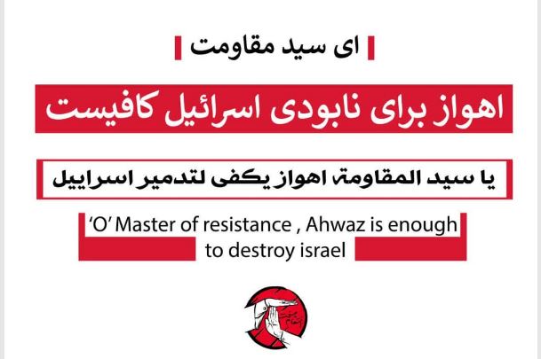 “O’ Master of the resistance, Ahwaz is enough to destroy Israel,” read the statement on the poster which also included a sign of Sayyed Nasrallah’s threat to return the US soldiers in the region to their homeland horizontally (dead) after they came vertically (alive).