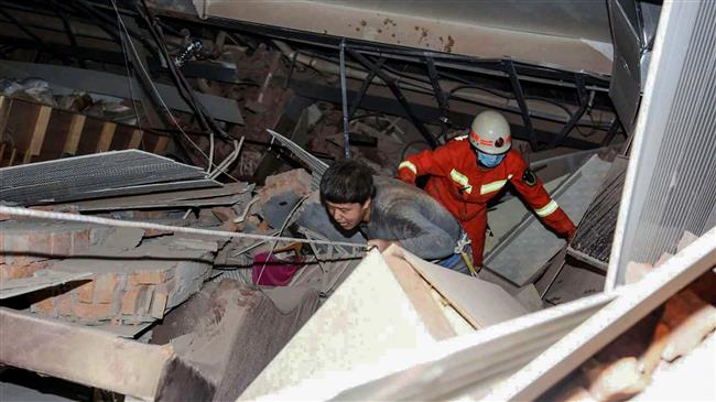 A video stream posted by the government-backed Beijing News site showed rescue workers in orange overalls clambering over rubble and twisted steelwork carrying people towards ambulances.